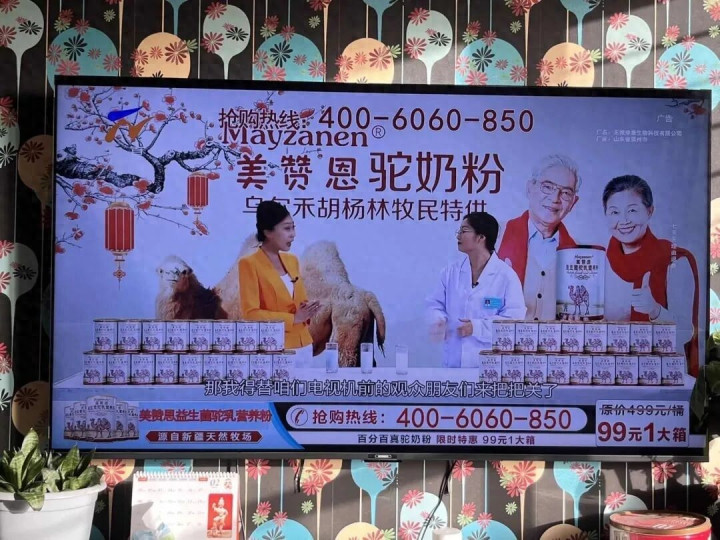 当今电视台上又出现肖似情况。宁夏卫视等多个省级频谈播出好意思赞恩驼奶粉告白,声称居品来改过疆乌尔禾胡杨林牧民特供,合适中老年东谈主补充养分。告白里原价每桶499元,当今一箱只须99元。