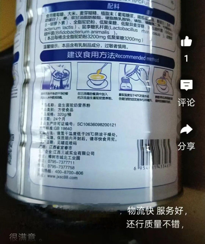 江西三本分业有限公司坐蓐的版块配料以葡萄糖、大米、麦芽糊精、植脂末为主,驼奶粉排在后头。