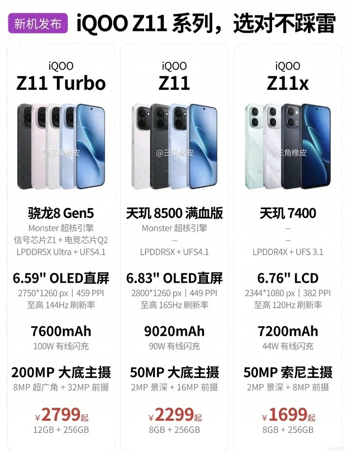 2026年4,iQOO品牌细致发布了全新的Z11系列智高东说念主机。这一系列共包含三款机型,区别是iQOO Z11 Turbo、iQOO Z11和iQOO Z11x。三款手机遮掩了从初学到高端的多个价位段,得志了不同用户的使用需求。为了让破钞者显著了解每款手机的特质,底下将逐个先容它们的硬件确立、屏幕训导、续航智商和影像系统等中枢参数。