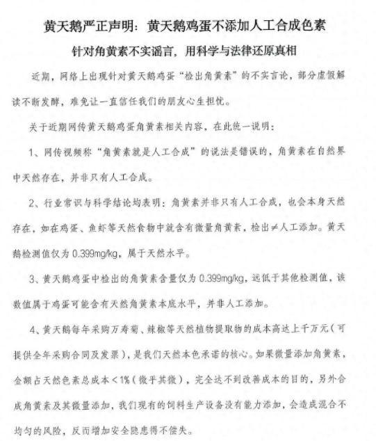 还有一丝挺有真义的,此次事件里,被检出角黄素的还有黄天鹅鸡蛋,黄天鹅一直宣传“自然植物性饲料”“不含东说念主工合成色素”,恶果被检出角黄素后,坐窝堕入空虚宣传的质疑中,而胖东来的回复,却让它在这场危急里,守住了大部分东说念主的信任。
