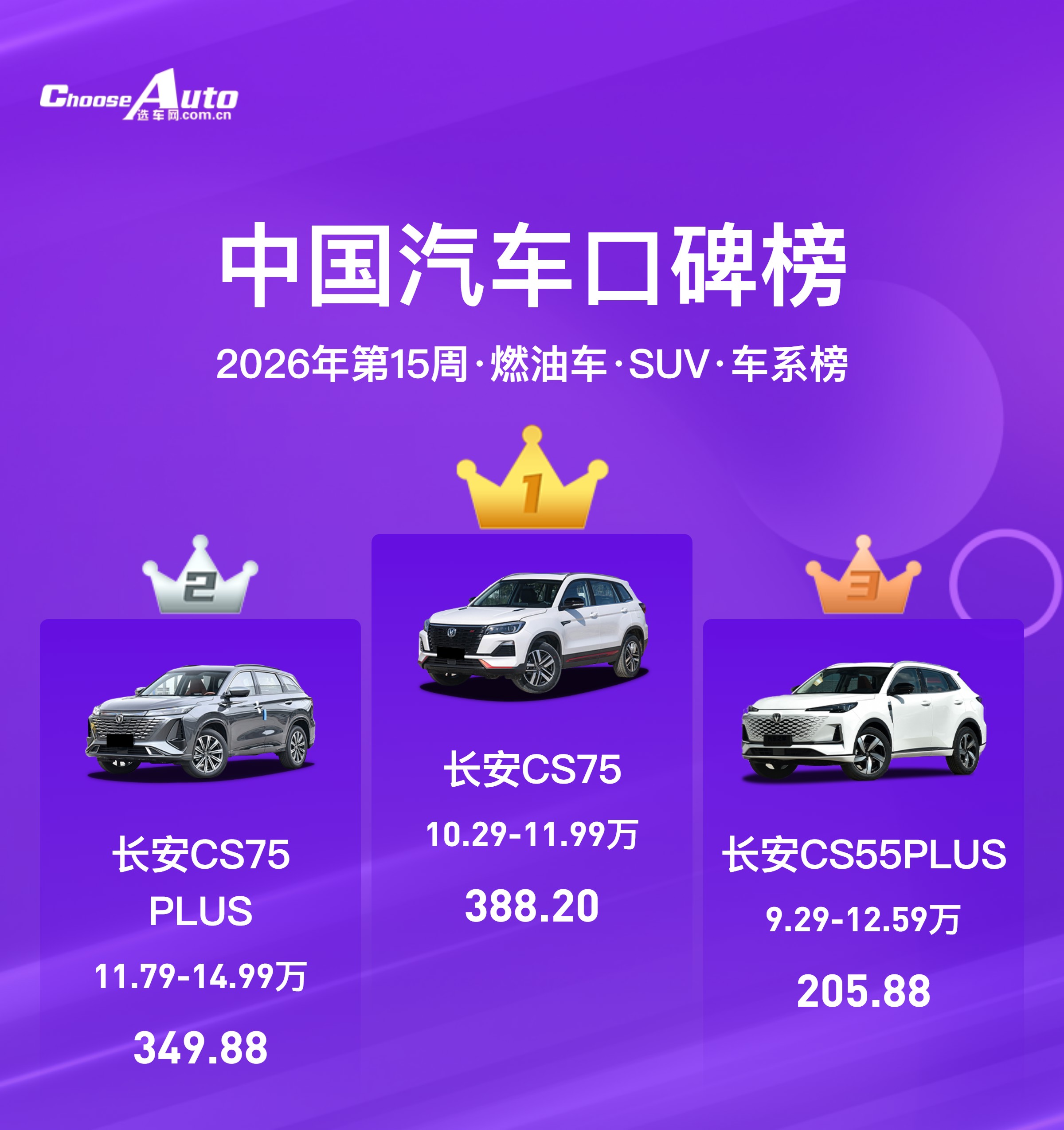 SUV 榜单不竭了长安车型的总揽力,长安 CS75 以388.20分拿下榜首,长安 CS75 PLUS、长安 CS55 PLUS 分列二、三位,三款车型袒护了 10-15 万级中枢家用 SUV 市集。