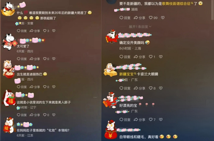 许多网友看到后都忍不住开打趣,说这宝宝像是在娘胎里整过容,一出身就带着“全妆”,还有东说念主说,这颜值太绝了,和小技术的迪丽热巴太像了,将来细目是个大明星。