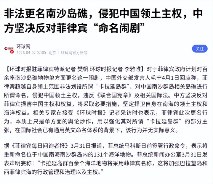 2.菲律宾作歹“更名”南沙群岛部分岛礁,酬酢部:执意反对 京报网 2026-4-1