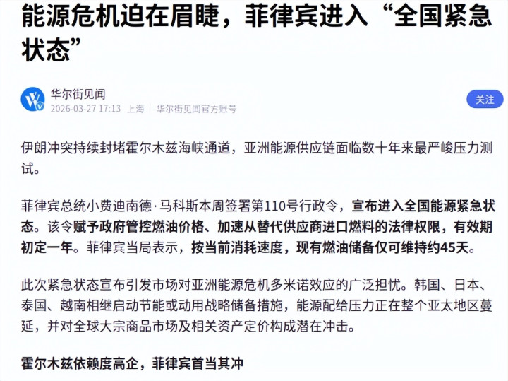 跟着好意思以伊干戈愈演愈烈,霍尔木兹海峡照旧被闭塞了起来,而这也让许多靠着海峡竣事动力供应的国度堕入了窘境,而菲律宾,无疑是处境最为粗重的一员。