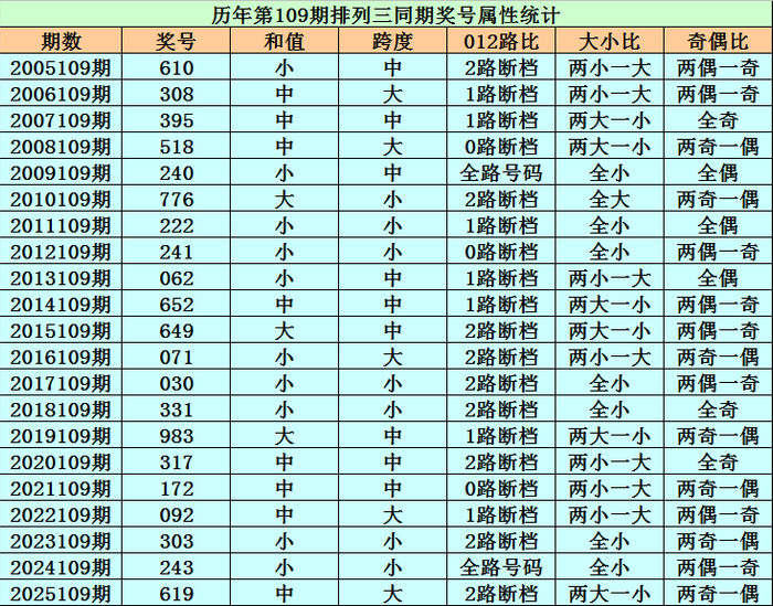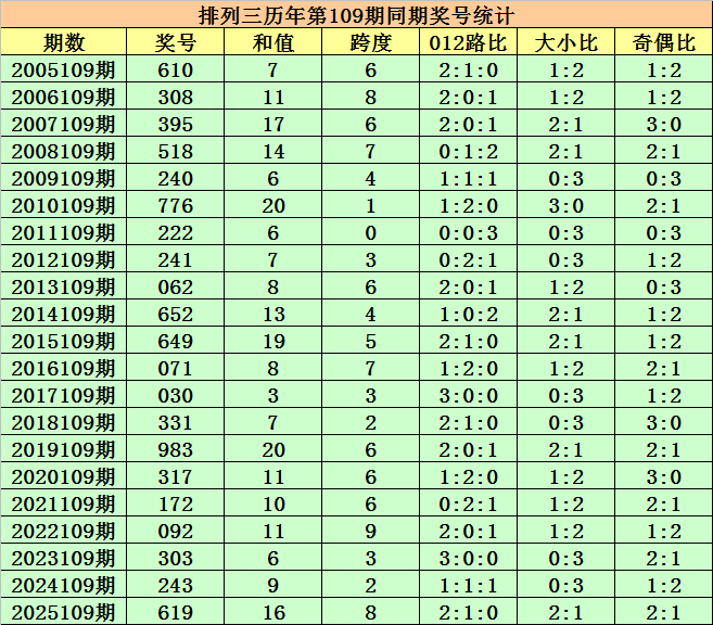 历史上第2026109期陈设三已开出21期奖号了,积年同时奖号离别为:610、308、395、518、240、776、222、241、062、652、649、071、030、331、983、317、172、092、303、243、619,详确统计见下表: