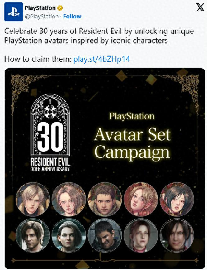 为庆祝《生化危急》系列出身30周年,PlayStation推出一套免费的《生化危急》头像,但赢得形势也引吐槽。