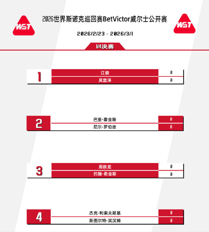北京时代2月28日凌晨,2026年斯诺克威尔士公开赛继续进行。今天凌晨3:00运行,3名中国选手吴宜泽、周跃龙、江俊强势出战1/4决赛。其中,新科国锦赛冠军吴宜泽与江俊演出中国德比战,志在冲击排行赛首冠的周跃龙挑战4届世锦赛冠军“巫师”约翰-希金斯。
